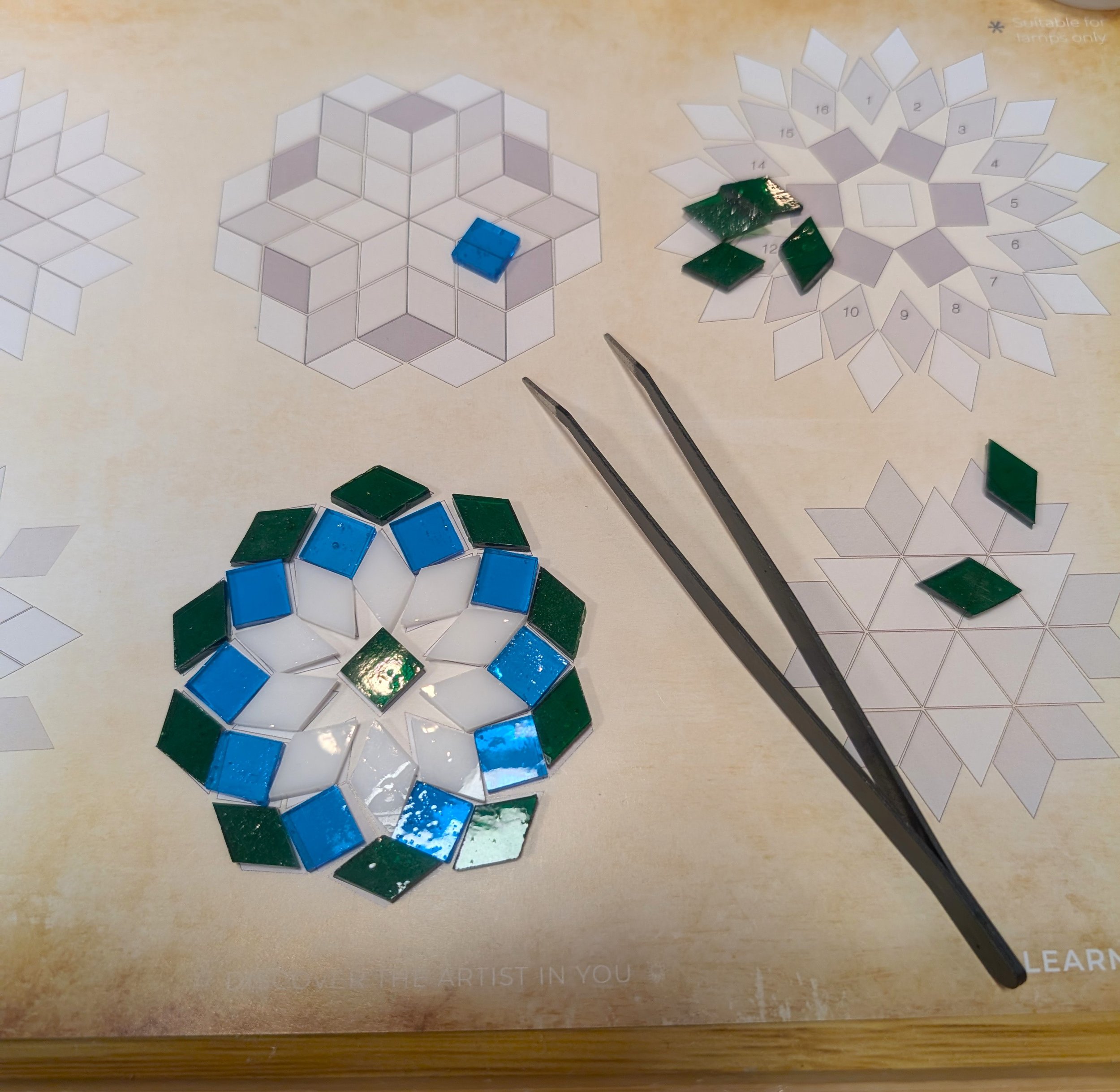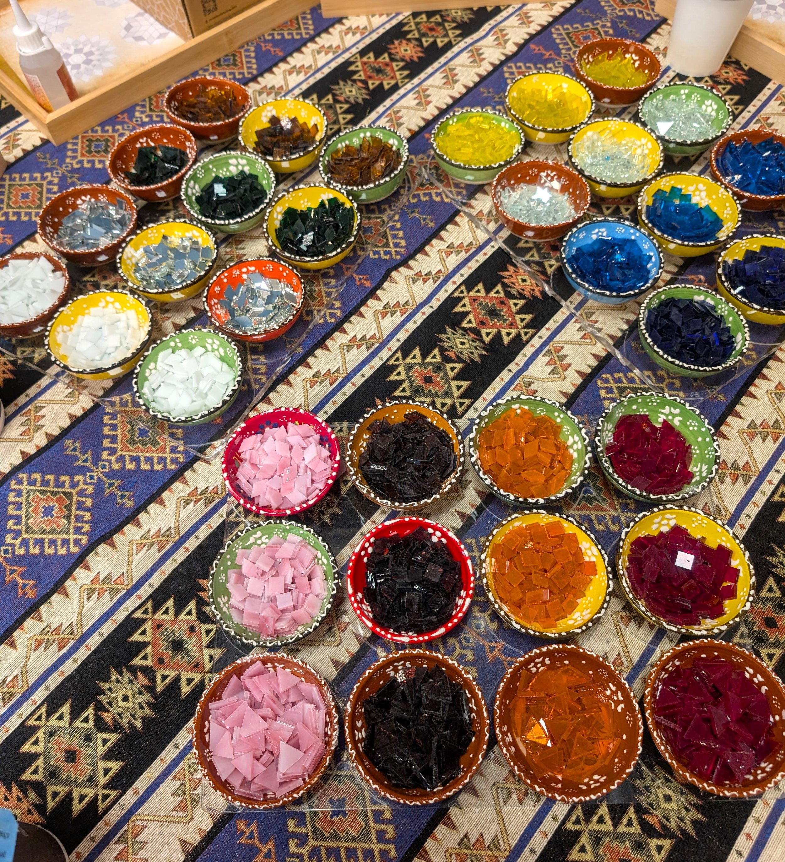 When we arrived our names were checked on the attendance list, we were handed our glass globes according to the size of project we had signed up for (there are a few different projects to choose from) and then we were shown to our table which we shared with 6 other ladies. Each spot at the table had a bamboo tray with a box of necessary supplies, a bottle of adhesive and a pattern template for a variety of designs in different sizes. In the middle of the table there was an assortment of small, beautifully patterned bowls filled with different cut glass pieces (diamond, square and triangle shapes) in the most gorgeous array of colours. It was definitely a feast for the eyes.