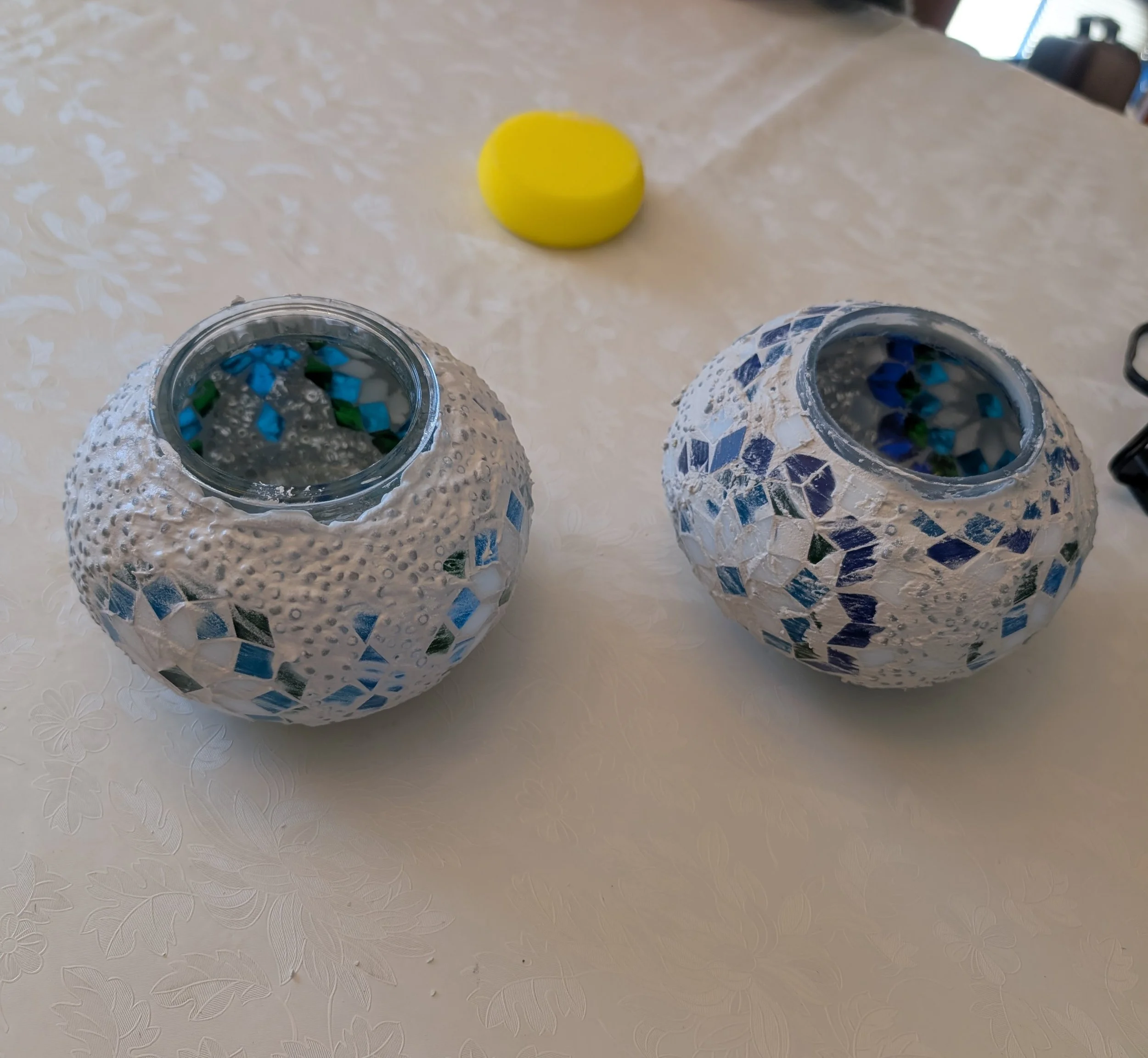 Because the adhesive had to cure for at least 8 hours, there was another kit that was sent home with us in order to complete our project. We did this job the day after our workshop. Grout had to be applied between the glass tiles and beads. The grout, a measuring cup, spreading tool, sponge and gloves were included in the kit. For those of you who have ever applied grout to floor or wall tiles, the procedure is exactly the same. Below left Kate is applying the grout, and below right the two globes are shown with the grout before the excess is removed with the sponge.